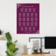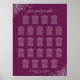 This beautiful 23 table wedding seating chart features a simple yet elegant design with pale grey text on a cassis purple, magenta, or berry coloured background and lacy faux foil silver floral filigree in the corners. The script calligraphy title reads: Please find your table. Contains table assignments for 230 guests at 10 guests per table.