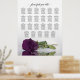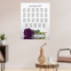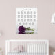 This 23 table wedding seating chart features a gorgeous image of a single long stemmed plum purple or eggplant coloured rose lying on its side reflecting in water with waves and ripples. The title reads "please find your table" in lacy script calligraphy. There is space for the couples' names and wedding date. This chart has table assignments for 230 guests 10 people per table.