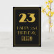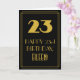 The front of this vintage look birthday themed greeting card design features a large art deco style inspired number "23", the message "HAPPY 23rd BIRTHDAY,", a personalised name, and a border pattern consisting of lines. The background of the front is coloured black. The inside features a customisable birthday greeting message, or could perhaps be cleared and left blank if a message is to be written by hand instead. A custom birthday card like this might be a fun way to send birthday wishes to somebody who is celebrating their twenty third birthday. [~Z0000502]