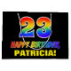 This colourful, fun, and cheerful birthday themed gift bag design features a large number "23" and the message "HAPPY BIRTHDAY,", both coloured with a rainbow spectrum gradient inspired pattern, along with a bold yellow custom recipient name. The background is coloured black. A fun gift bag like this might be used when giving a gift or present in honour of somebody’s twenty third birthday. [~Z0000477]