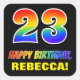 This colourful, cheerful, and fun birthday themed sticker design features a large number "23" and the message "HAPPY BIRTHDAY,", both coloured with a rainbow spectrum gradient inspired pattern, along with a bold yellow personalised name. The background is coloured black. Fun birthday themed stickers like this could be used when wrapping a gift or present being given to somebody who is celebrating their 23rd birthday, or perhaps may be handed out to the guests at a birthday party. [~Z0000480]