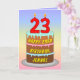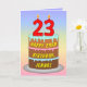 This cheerful and upbeat birthday greeting card design features a cartoon-style depiction of a three-tier birthday cake having numeral-shaped candles on top showing the number “23“, along with the message “HAPPY 23RD BIRTHDAY,”, and a custom recipient name. The background of the front has a multicolored pastel rainbow spectrum inspired gradient pattern. The inside has an editable birthday greeting message, or could perhaps be cleared and left blank if a message is to be written by hand instead. A colourful, customisable birthday greeting card like this might be sent to celebrate somebody’s twenty-third birthday. [~Z0000625]
