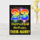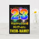 The front of this colourful, exciting, and fun birthday themed greeting card design features a large number "23" with a rainbow spectrum gradient inspired pattern, along with the message "Happy 23rd Birthday,", and a customisable recipient name. The front additionally has a colourful bursting celebratory fireworks inspired background pattern. The inside features an editable birthday greeting message, or could perhaps be cleared and left blank if a message is to be written by hand instead. A customisable birthday card like this might be a fun way to send a message celebrating somebody’s twenty third birthday. [~Z0000442]