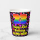 This joyful and colourful birthday themed paper cup design features a large number “23” having a rainbow spectrum gradient inspired pattern. It also features the message “Happy 23rd Birthday,”, and a personalised name. The background features a pattern of red, purple, and pink heart shapes of various sizes. Cheerful, fun paper cups like this might be fun to use at a birthday celebration/party being held to honour somebody’s twenty third birthday. [~Z0000548]