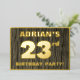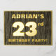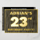 The front of this bold twenty-third birthday party/celebration foil invitation card features a custom name, a large number “23rd”, the message “BIRTHDAY PARTY!”, and a border, all in foil. There is a rustic, yet sophisticated, faux wood grain look inspired pattern for the background of the front. The back features personalised details about the event, such as the date, time, venue/location, and any other important information. Editable invitations like these might be used to invite guests to a birthday party/gathering being held in celebration of somebody’s 23rd birthday. [~Z0000598]