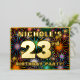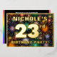 The front of this upbeat and fun twenty-third birthday celebration/party foil invitation card design features a customisable name, a large number “23rd”, the message “BIRTHDAY PARTY!”, and a border. The background of the front has a vibrant, multicolored bursting celebratory fireworks-inspired pattern. The back features personalised details about the event, such as the date, time, venue, and any other information that may be relevant. Editable invitations like these might be a fun way to invite guests to a birthday gathering/party being held in celebration of somebody’s 23rd birthday. [~Z0000602]