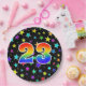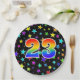 This colourful, cheerful, and fun paper plate design features a large number "23" containing a rainbow spectrum gradient inspired pattern colouring. The background features a colourful pattern of star shapes. Paper plates like this might be used when celebrating somebody’s 23rd birthday, or a couple’s 23rd wedding anniversary, or some other twenty-third event. [~Z0000493]
