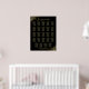 This beautiful wedding seating chart is simple yet elegant. It features a beautiful design of gold text on a black background with lacy gold faux foil floral filigree in the corners. It includes table assignments for 240 guests with 10 guests per table.