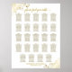 This beautiful wedding seating chart is simple yet elegant. It features a beautiful design of gold text on a white background with lacy gold faux foil floral filigree in the corners. It includes table assignments for 240 guests with 10 guests per table.