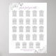 This beautiful wedding seating chart is simple yet elegant. It features a beautiful design of dark gray and light purple or lavender text on a white background with lacy silver faux foil floral filigree in the corners. Ornate curls and frills make the design fancy and high class. It includes table assignments for 240 guests with 10 guests per table.