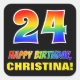 This fun, colourful, and cheerful birthday sticker design features a large number "24" and the message "HAPPY BIRTHDAY,", both coloured with a rainbow spectrum gradient inspired pattern, along with a bold yellow personalised name. The background is coloured black. Fun birthday themed stickers like this might be used when giving a gift or present in celebration of somebody’s 24th birthday, or perhaps might be given out to the guests at a birthday celebration. [~Z0000480]