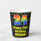 This cheerful and colourful music-themed birthday paper cup design features a large number “24” with a rainbow spectrum gradient inspired pattern, along with the message “Happy 24th Birthday,”, and a custom name. The background features an exciting and colourful pattern having music notes and symbols of various colours and sizes. Colourful, vibrant paper cups like this might be fun to use at a birthday celebration/party being held to honour somebody’s 24th birthday. [~Z0000541]