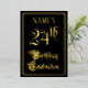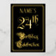 The front of this luxurious, opulent, foil twenty-fourth birthday party/celebration invitation design features the message “24th Birthday Celebration” in elegant script-style text. It also has a custom name. The background of the front is coloured black by default (although it can be customised to a different colour). The back features personalised details about the event, such as the date, time, location, and any other information that may be relevant. Elegant, fancy, personalised invitations like these might be used to invite guests to a birthday celebration/party being held to honour somebody’s 24th birthday. [~Z0000589]