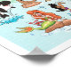 Bright and detailed whimsical vision of Southern California - featuring Los Angeles, Long Beach, San Diego and other major and minor cities plus most beach towns - zany characters play on the beach and desert, mountains and valleys. This charming scene has it all – a surfer hangs ten while a mermaid lounges on a rock, a killer whale leaps out of the water as a t-rex roars a challenge, a muscular beach couple both flex to impress, zoo animals wait for tourists and a bull smashes into a bull fighter…
