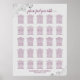 This beautiful wedding seating chart includes table assignments for 250 guests with 10 guests per table. The design is simple yet elegant featuring cassis purple or magenta colored text on a gray background with lacy silver faux foil floral filigree in the corners, and calligraphy script reading: please find your table.