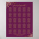 This beautiful wedding seating chart includes table assignments for 250 guests with 10 guests per table. The design is simple yet elegant featuring gold text on a magenta or cassis purple coloured background with lacy faux foil floral filigree in the corners, and calligraphy script reading: please find your table.