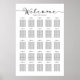 Welcome sign. Up to 25 Table layout, 10 guests per table. Laid out by table number, but you can edit the titles to be alphabetical by last name as well. A simple black and white seating chart; click "customise it" to move columns, change fonts, colours, background colour or size of poster. White text on coloured versions also available.