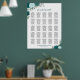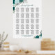 This beautiful wedding seating chart features a rustic boho chic watercolor design of teal, aqua, and cyan coloured roses, accompanied by sprigs of eucalyptus leaves and garden greenery. With 25 tables and a traditional layout, it can accommodate up to 250 guests with 10 seats per table. The elegant calligraphy title reading "please find your table" adds a touch of sophistication, and there's space to include the names of the couple and wedding date at the bottom. This seating chart not only beauty and charm to your wedding reception, but also ensures that your guests can easily locate their assigned tables.