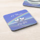 Pretty drink coasters with my artwork of silver hearts floating on the water under a rainbow with text that says "25 Years".