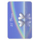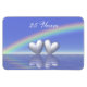 A magnet with my design of two silver-colored hearts floating on peaceful waters, under a rainbow and blue skies with customizable text that says "25 Years".