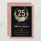 Chic 25th or any age birthday design with blush pink glitter elements and a pretty floral wreath contrasted by a black background.