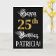 The front of this lavish and luxurious birthday greeting card design features the message “Happy 25th Birthday,”, and a personalised recipient name. Some of the message is in a fancy script-style text. The large number “25th” features a faux/imitation gold-inspired look pattern. The background is coloured black. The inside has a customisable birthday greeting message, or could perhaps be cleared and left blank if a message is to be written by hand instead. An ornate, customisable birthday greeting card like this might be used to acknowledge somebody’s twenty-fifth birthday. [~Z0000559]