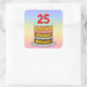 This colourful and upbeat birthday themed square sticker design features a cartoon-style depiction of a three-tier birthday cake having number-shaped candles on top showing the age “25“, along with the message “HAPPY 25TH BIRTHDAY,”, and a personalised recipient name. The background has a multicolored pastel rainbow spectrum inspired gradient pattern. Stickers like these might be used when celebrating somebody’s 25th birthday. [~Z0000624]