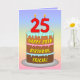 This colourful and joyful birthday greeting card design features a cartoon-style depiction of a three-tier birthday cake having numeral-shaped candles on top showing the number “25“, along with the message “HAPPY 25TH BIRTHDAY,”, and a personalised recipient name. The background of the front features a multicolored pastel rainbow spectrum inspired gradient pattern. The inside has a custom birthday greeting message, or could perhaps be cleared and left blank if a message is to be written by hand instead. A fun, customised birthday greeting card like this might be sent to celebrate somebody’s twenty-fifth birthday. [~Z0000625]