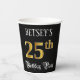 This opulent and fancy birthday-themed paper cup design features a customizable name and the message “25th Birthday Party”. The large number “25th” has an imitation/faux gold-inspired coloring pattern, the words “Birthday Party” are in elegant script-style text, and the background is colored black by default (although it can be customized). Luxurious, ornate paper cups like this might be useful to have at a birthday party being held to celebrate somebody’s twenty fifth birthday. [~Z0000567]