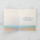 A blank invitation paper with an envelope rests on a sandy beach against the backdrop of gently swaying palm trees and a serene ocean under a vibrant sunset for 25th anniversary.