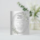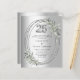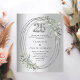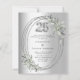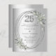 A faux silver looking background. An oval silver frame decorated eith sage green greenery. Personalise and add your names, details. Black text.