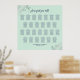 This beautiful wedding seating chart features navy blue text on a light green or neo mint colored background with seating assignments for 260 guests - 26 tables at 10 seats per table. It features a simple yet stylish and elegant design with ornate decorative faux foil silver gray filigree in the corners. The title is written in fancy script calligraphy and reads: Please find your table.