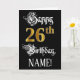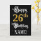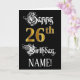The front of this elaborate and opulent birthday-themed greeting card design features the message “Happy 26th Birthday,”, and an editable recipient name. Part of the message is in a lavish script-style text, the large number “26th” features a faux/imitation gold-inspired look pattern, and the background is coloured black. The inside has a customised birthday greeting message, or could perhaps be cleared and left blank if a message is to be written by hand instead. A luxurious, editable birthday greeting card like this might be sent to celebrate somebody’s twenty-sixth birthday. [~Z0000559]