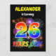 The front of this vibrant and exciting birthday party invitation postcard design has a personalised name, a fun bursting celebratory fireworks inspired pattern, and the message "26 YEARS OLD!" having a colourful rainbow spectrum inspired gradient pattern. The back features a personalised message with information about the party, such as when and where it is being held. Invitation postcards like this could be sent to potential guests of a birthday party being held in celebration of somebody’s twenty sixth birthday. [~Z0000452]