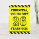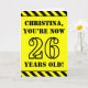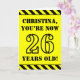 The front of this bold and attention-grabbing birthday-themed greeting card design features a personalised name and the message "YOU’RE NOW 26 YEARS OLD!" in black stencil look text on a yellow coloured background. The front also features an eye-catching yellow and black stripes pattern at the top and bottom edges. The inside features a personalised birthday greeting message, or could perhaps be cleared and left blank if a message is to be written by hand instead. A customisable birthday card like this might be a fun way to acknowledge somebody’s twenty sixth birthday. [~Z0000413]