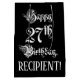 This fancy and opulent birthday gift bag design features the message “Happy 27th Birthday,” in ornate script style text, on a black coloured background. It also features a customisable recipient name. A gift-bag like this might be used when wrapping gifts being given to somebody in celebration of their 27th birthday. [~Z0000557]