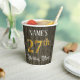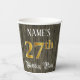 This luxurious and elegant birthday themed paper cup design features a personalised name and the message “27th Birthday Party”. The large number “27th” has a faux/imitation gold-inspired colouring pattern, and the words “Birthday Party” are in fancy script-style text. The background has an imitation/faux woodgrain-inspired pattern. Ornate, opulent paper cups like this might be used at a birthday party being held to celebrate somebody’s 27th birthday. [~Z0000568]