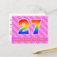 The front of this happy, upbeat, and fun birthday postcard design features a large number "27" having a rainbow spectrum gradient inspired pattern. It also features the message "Happy 27th Birthday,", and an editable recipient name. The front additionally has a cheerful light pink and dark pink striped pattern featuring heart shapes. The back features a customised birthday greeting message, or could perhaps be cleared and left blank if a message is to be written by hand instead. A customisable birthday postcard like this might be a fun way to celebrate somebody’s twenty seventh birthday. Postcards like this might also be used to invite guests to a birthday celebration being held for somebody who is turning 27 years old. [~Z0000449]