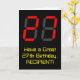 The front of this silly and fun birthday themed greeting card design features a large number "27" with a red seven segment digital display inspired appearance, along with the message "Have a Great 27th Birthday," and a personalised name, on a black coloured background. The inside features a personalised birthday greeting message, or could perhaps be cleared and left blank if a message is to be written by hand instead. A personalised birthday card like this might be a fun way to send a message in celebration of somebody’s twenty seventh birthday. [~Z0000386]