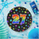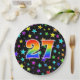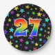 This colourful, cheerful, and fun paper plate design features a large number "27" having a rainbow spectrum gradient inspired pattern colouring. The background features a colourful pattern of star shapes. Fun paper plates like this might be used at somebody’s twenty-seventh birthday party, or a couple’s 27th anniversary celebration, or some other 27th event. [~Z0000493]