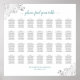 This beautiful wedding seating chart features a simple yet elegant design with dark grey and teal or turquoise text on a white background. The title is written in script calligraphy lettering and reads: please find your table. The chart is decorated with a frilly floral faux foil silver curls and swirls in the corners. Contains seating assignments for 28 tables at 10 guests per table or 280 guests.