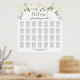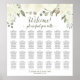 This beautiful 28 table wedding seating chart features a hand painted watercolor design with ivory, white, or cream coloured roses, flowers, and blossoms, along with sage green eucalyptus leaves and garden foliage. The elegant script calligraphy title reads "Welcome! please find your table". The seating chart has space for 280 guests with 10 seats per table, and there is room for the names of the couple and wedding date at the bottom. Wonderful way to welcome your guests to your reception while making it easy for them to find their seats.