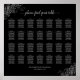 This beautiful wedding seating chart features a simple yet elegant design with pale grey text on a black background. The title is written in script calligraphy lettering and reads: please find your table. The chart is decorated with a frilly floral faux foil silver filigree in the corners. Contains seating assignments for 28 tables at 10 guests per table or 280 guests.