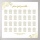 This beautiful wedding seating chart features a simple yet elegant design with gold text on a white background. The title is written in script calligraphy lettering and reads: please find your table. The chart is decorated with a frilly floral faux foil gold filigree in the corners. Contains seating assignments for 28 tables at 10 guests per table or 280 guests.