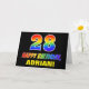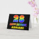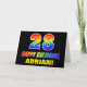 The front of this cheerful, colorful, and fun birthday-themed greeting card design features a large number "28" and the message "HAPPY BIRTHDAY,", both colored with a rainbow spectrum gradient inspired pattern, along with a bold yellow customizable recipient name. The front also features a minimalist black colored background. The inside has a custom birthday greeting message, or could perhaps be cleared and left blank if a message is to be written by hand instead. A cheerful personalized birthday card like this might be a fun way to send a message celebrating somebody’s twenty eighth birthday. [~Z0000472]