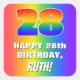 This joyful and vibrant birthday square sticker design features a large number “28” having a colourful rainbow spectrum inspired gradient pattern. It also features the message “HAPPY 28th BIRTHDAY,”, and an editable recipient name. The background also features a fun multicolored rainbow spectrum inspired gradient pattern. Fun, personalised stickers like this might be given as a birthday present, or used while wrapping gifts/presents, or perhaps used as a birthday party decoration when celebrating somebody’s twenty eighth birthday. [~Z0000571]