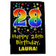This exciting, vibrant, and fun birthday-themed giftbag design features a large number "28" with a rainbow spectrum gradient style pattern, along with the message "Happy 28th Birthday,", and a customisable recipient name. It also has a background pattern featuring star shapes of various sizes and colours. A gift bag like this might be used when giving a gift or present in honour of somebody’s 28th birthday. [~Z0000510]
