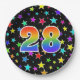 This fun, colourful, and cheerful paper plate design features a large number "28" coloured with a rainbow spectrum gradient inspired pattern. The background features a colourful star shapes pattern. Paper plates like this might be used when celebrating somebody’s twenty eighth birthday, or a couple’s 28th anniversary, or some other twenty eighth event. [~Z0000493]
