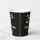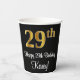 This stylish, luxurious, and sophisticated birthday themed paper cup design features a large ordinal number “29th” having a faux/imitation gold-like appearance, in addition to the birthday greeting message “Happy 29th Birthday,” and a custom name in a script-style font. It also has a black-coloured background. Paper cups like this might be used at a party held in celebration of somebody’s twenty ninth birthday. [~Z0000538]