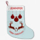 Festive Christmas stocking, personalised with a name which also says "Merry Christmas" in curved text. Designed with an illustration of 2 Christmas deer jumping. Deer are made of red and black lumberjack plaid, with a little heart in between them. Red and black plaid Christmas decorations hang down from the top. Light blue background.